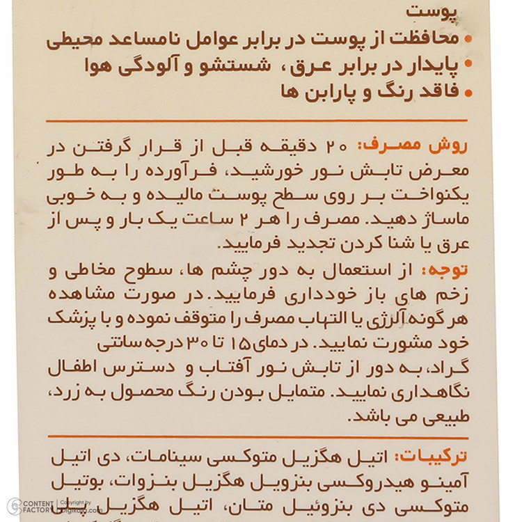 ضد آب , محافظت کننده در برابر اشعه UVA , محافظت کننده در برابر اشعه UVB , ضد حساسیت , غیر کومدون زا , فاقد پارابن