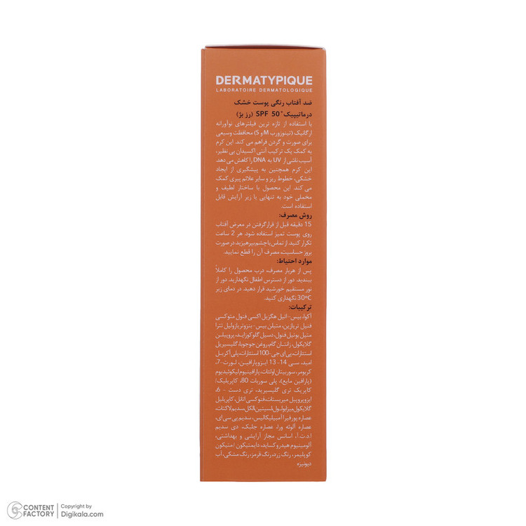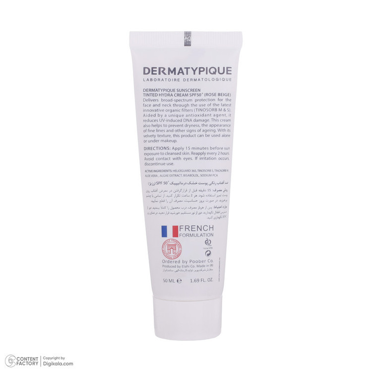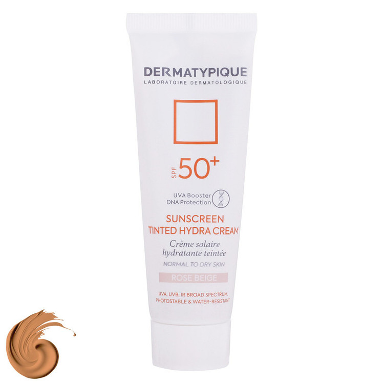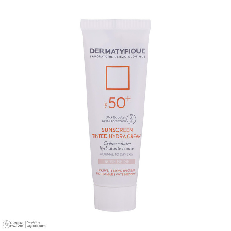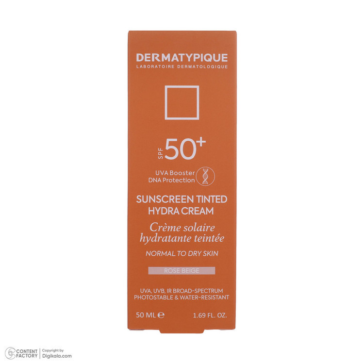 کرم ضد آفتاب رنگی درماتیپیک، 50 SPF، مدل هیدرا، مناسب پوست نرمال تا خشک تنالیته رنگ روشن و حجم 50 میلی‌لیتر، محافظت کننده در برابر اشعه UVA، UVB، IR، ضد آب، ضد خطوط ریز و پیری پوست، مرطوب کننده، التیام‌بخش، با ماندگاری 2 ساعته