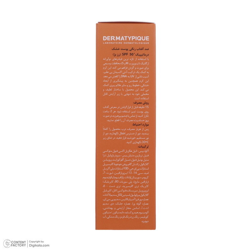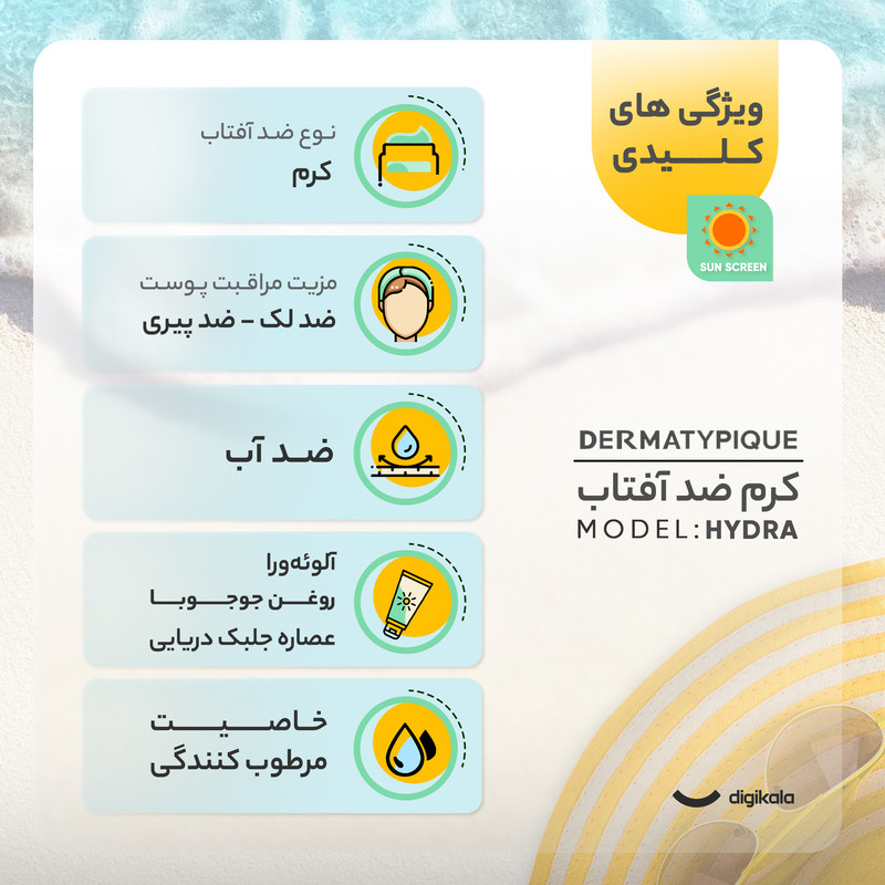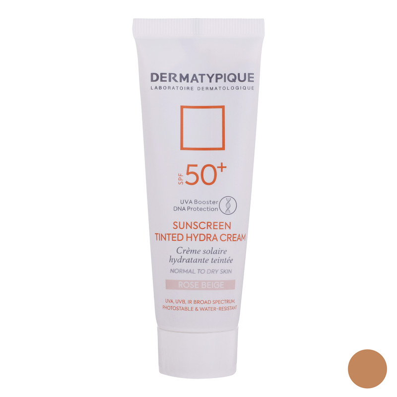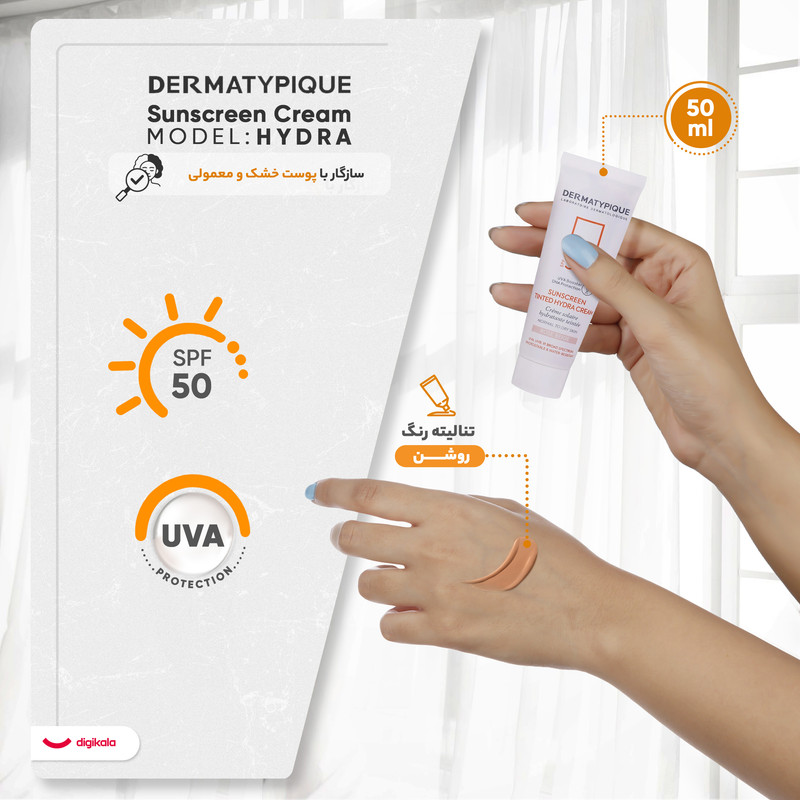 کرم ضد آفتاب رنگی درماتیپیک، 50 SPF، مدل هیدرا، مناسب پوست نرمال تا خشک تنالیته رنگ روشن و حجم 50 میلی‌لیتر، محافظت کننده در برابر اشعه UVA، UVB، IR، ضد آب، ضد خطوط ریز و پیری پوست، مرطوب کننده، التیام‌بخش، با ماندگاری 2 ساعته