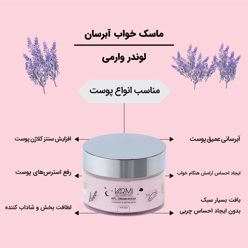 زمانی که خواب هستیم از دغدغههای روزانه جدا میشویم و برای ساعاتی میتوانیم در عالم رویا غرق شویم و از واقعیت فاصله بگیریم، ماسک خواب همراه شما در این لحظات است. هنگام خواب، پوست در بیشترین حالت بازسازی و ترمیم قرار دارد در نتیجه مراقبت بیشتری احتیاج دارد؛ ماسک خواب آبرسان لوندر وارمی همان چیزی است که پوست را سیراب میکند! این ماسک صورت نیاز به شستشو ندارد، به سرعت جذب میشود و یک خواب راحت و آرام را برای شما به ارمغان میآورد. لوندر راز آرامش باور نکردنی این ماسک است! استرسها، چالشها و درگیریهای روز را فراموش کنید و پوست خود را به معجزهی لوندر بسپارید. لوندر نه تنها در افزایش کیفیت خواب و رفع اضطراب تاثیر به سزایی دارد؛ بلکه به دلیل دارا بودن آنتی اکسیدان فراوان از آسیب زدن رادیکالهای آزاد به سطح پوست جلوگیری میکند اگر پوست شما چرب است، خود را از ماسک آبرسان خواب وارمی حاوی لوندر محروم نکنید! بسیاری از افرادی که پوست چرب دارند قبل از خواب از کرمها و آبرسانها استفاده نمیکنند چرا که صبح فردا پوست آنها چربتر خواهد شد؛ اما در مورد ماسک آبرسان خواب وارمی این موضوع صدق نمیکند. ماسک آبرسان خواب وارمی بافت کرم ژل بسیار سبک دارد که به سرعت جذب میشود در نتیجه نیازی نیست نگران باز شدن منافذ پوست، چربی بیش از حد و ایجاد جوشهای سطحی و زیرپوستی باشید. ماسک آبرسان خواب مواد موثر و در نتیجه آبرسانی بیشتری به نسبت کرم شب دارد و پوست نرمتر و شادابتر میشود.