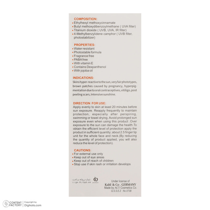 ویژگیهای ضدآفتاب : ضد آب , محافظت کننده در برابر اشعه UVA , محافظت کننده در برابر اشعه UVB