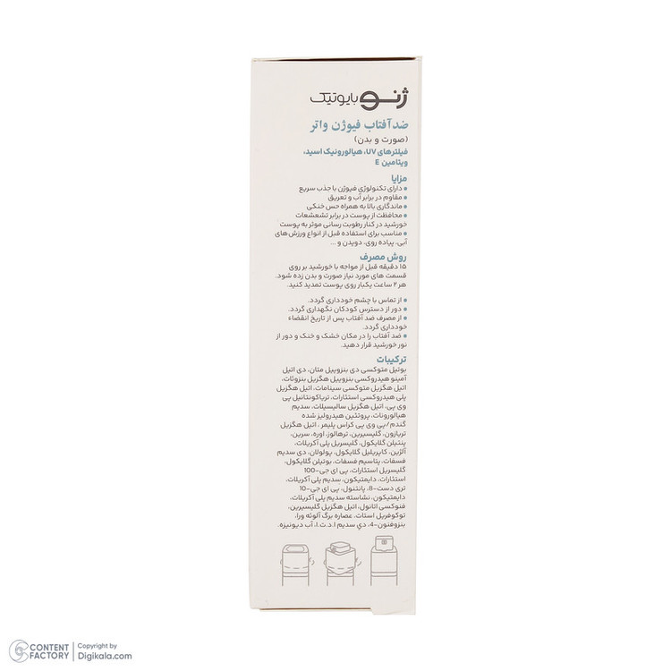 ویژگیهای ضدآفتاب : ضد آب , محافظت کننده در برابر اشعه UVA , محافظت کننده در برابر اشعه UVB
