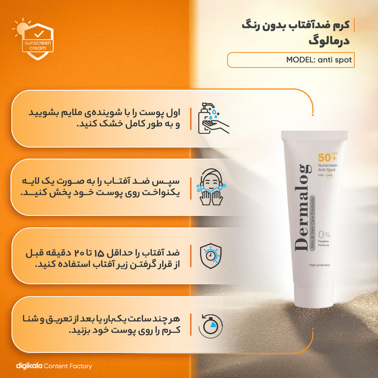 مقدار کافی از کرم را 15 دقیقه قبل از تماس با اشعه خورشید روی پوست خود بمالید و هر 2 الی 4 ساعت تکرار کنید.