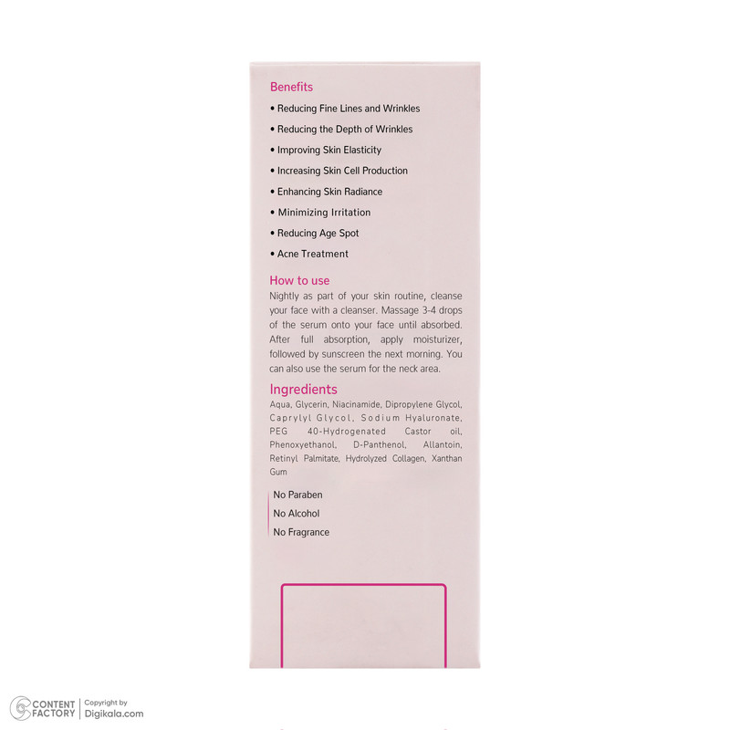 رتینول به عنوان مشتق ویتامین A با قدرت کلاژن سازی فوقالعاده، بافت پوست را بهبود بخشیده و چین و چروک را کاهش میدهد. هیالورونیک اسید با جذب رطوبت فوقالعاده، پوستی صاف و سفت را برای شما به ارمغان میآورد. نیاسینامید پوست را روشنتر کرده و التهاب را کاهش میدهد، در حالی که کلاژن هیدرولیز شده به تقویت ساختار پوست و بهبود خاصیت ارتجاعی آن کمک شایانی میکند.