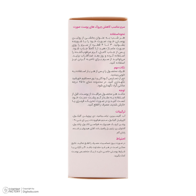 ترکیبات : رتینول , کلاژن , بدون پارابن , فاقد چربی , بدون الکل , گلیسیرین , هیالورونیک اسید , غنی شده با ویتامین , نیاسینامید