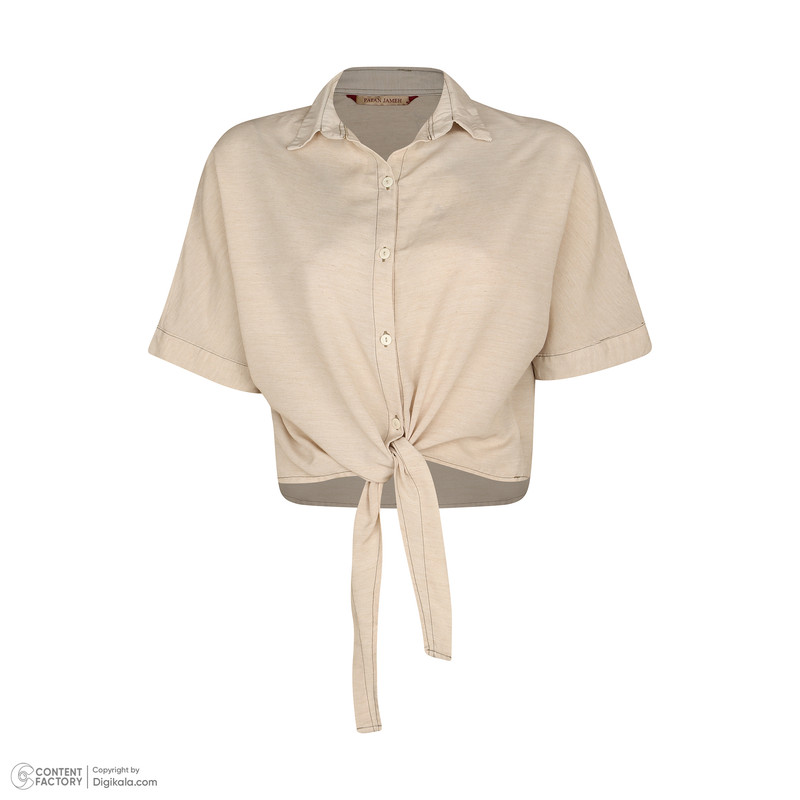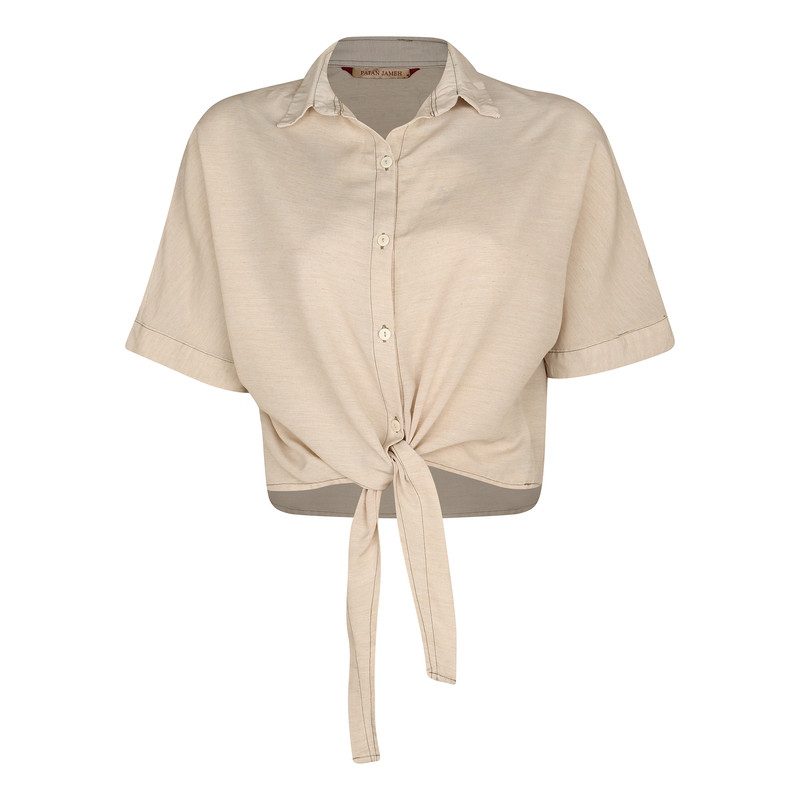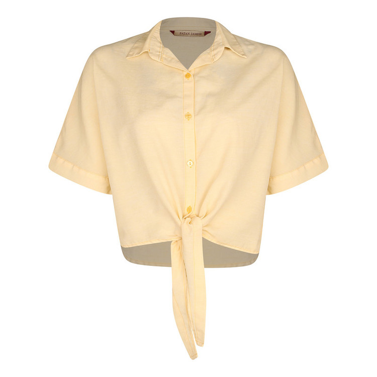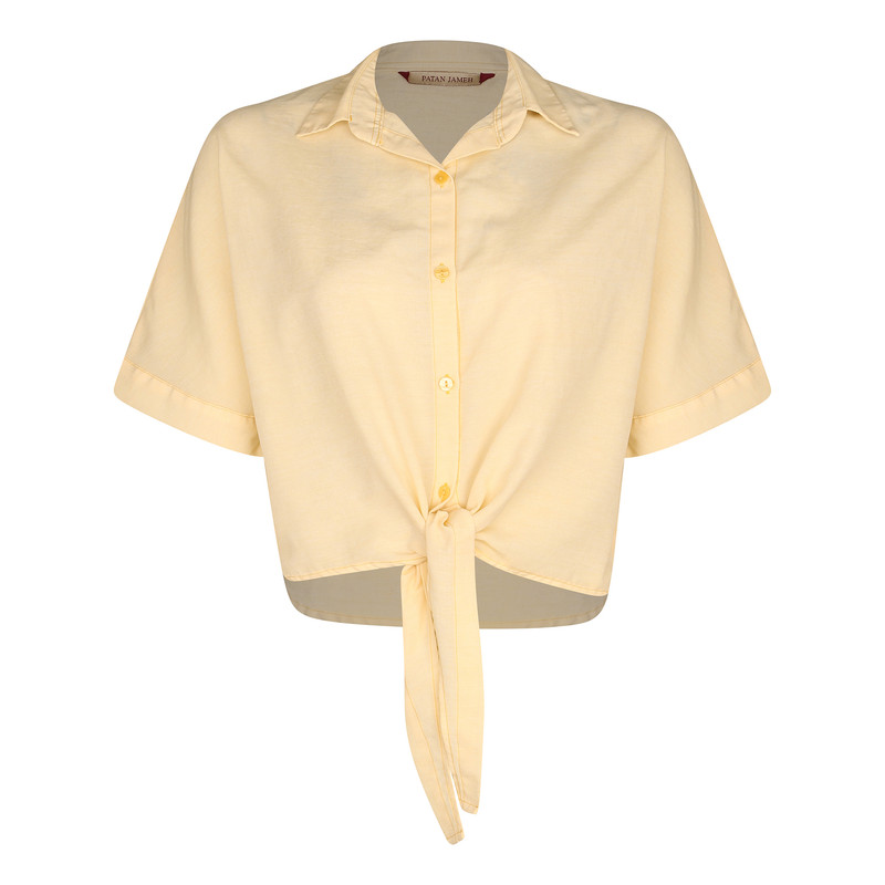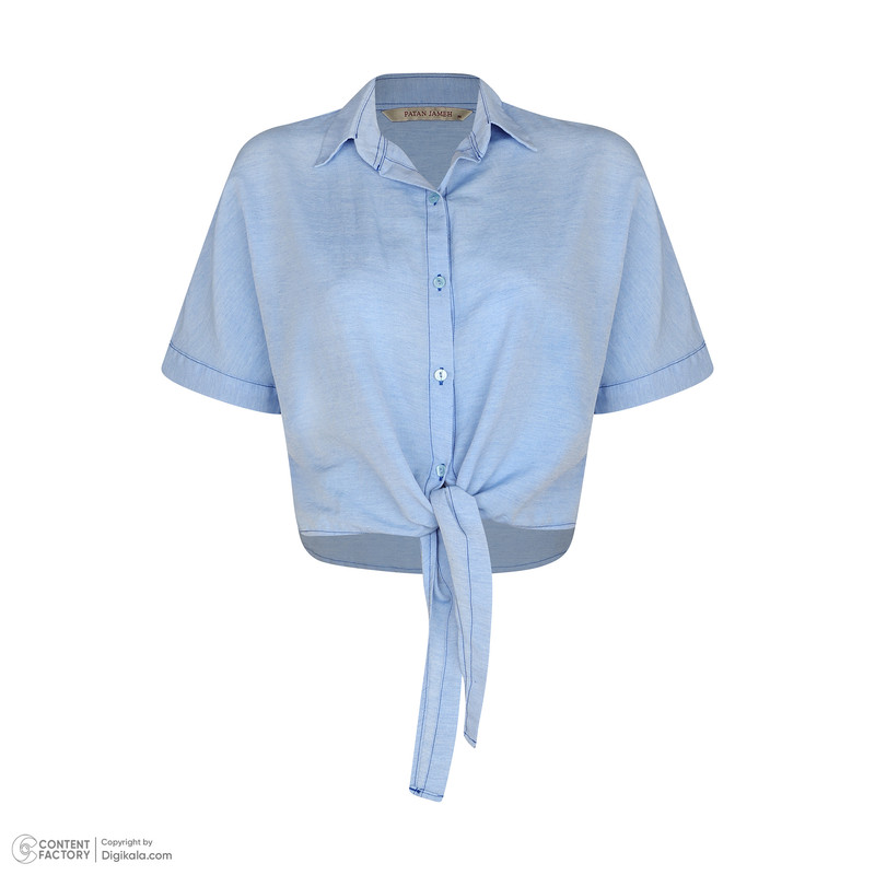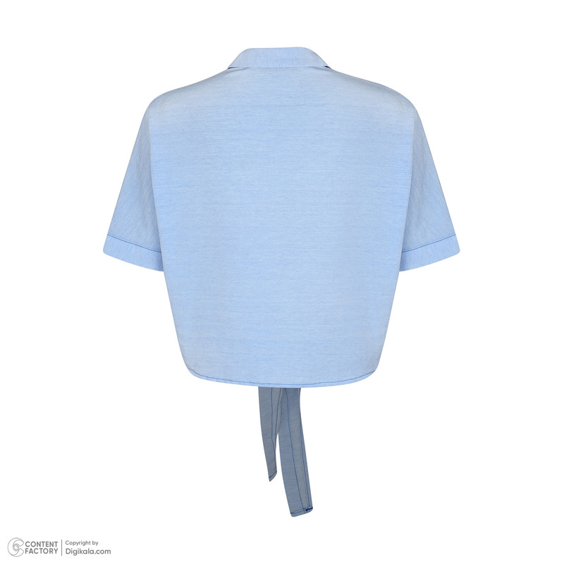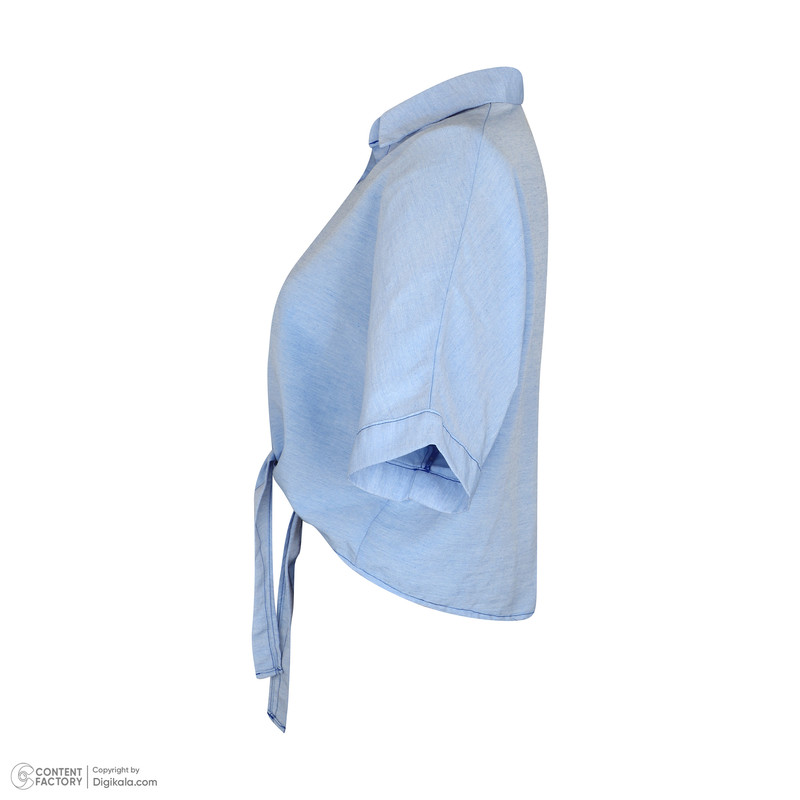 شومیز کراپ زنانه / جنس 65 درصد پلی استر - 35 درصد کتان /نحوه بسته شدن دکمه و جلو گره دار / قد تا روی کمر / دارای یقه برگردان ، رنگ آبی .