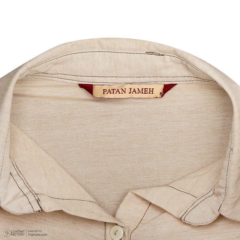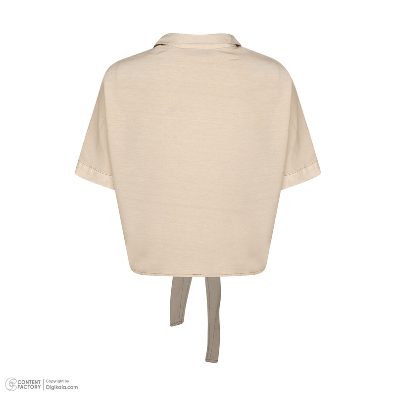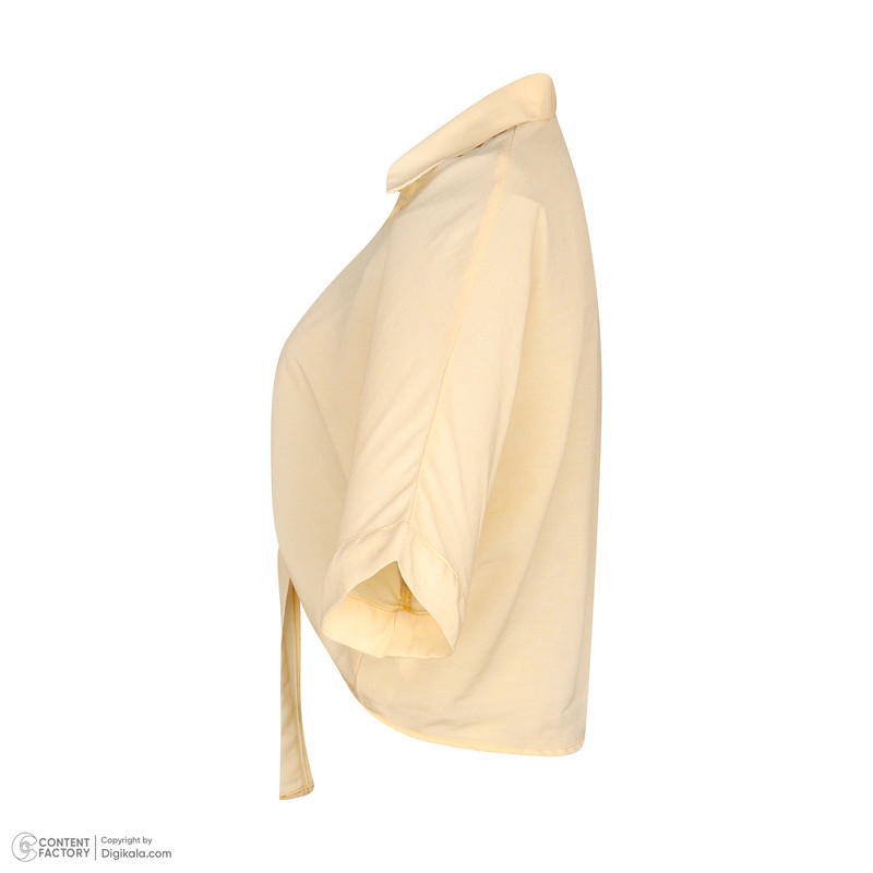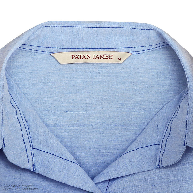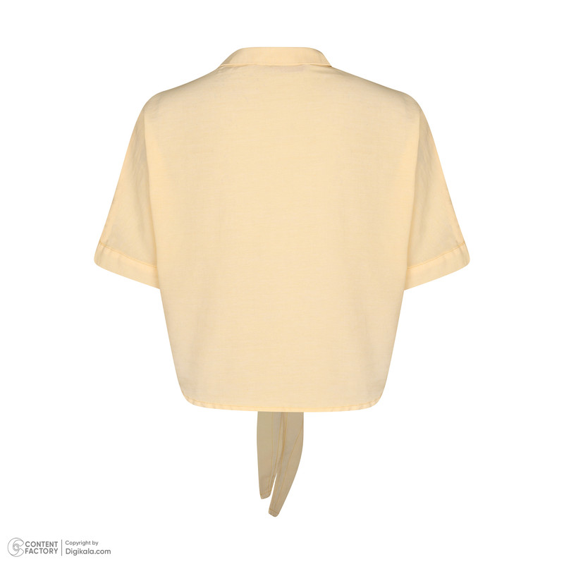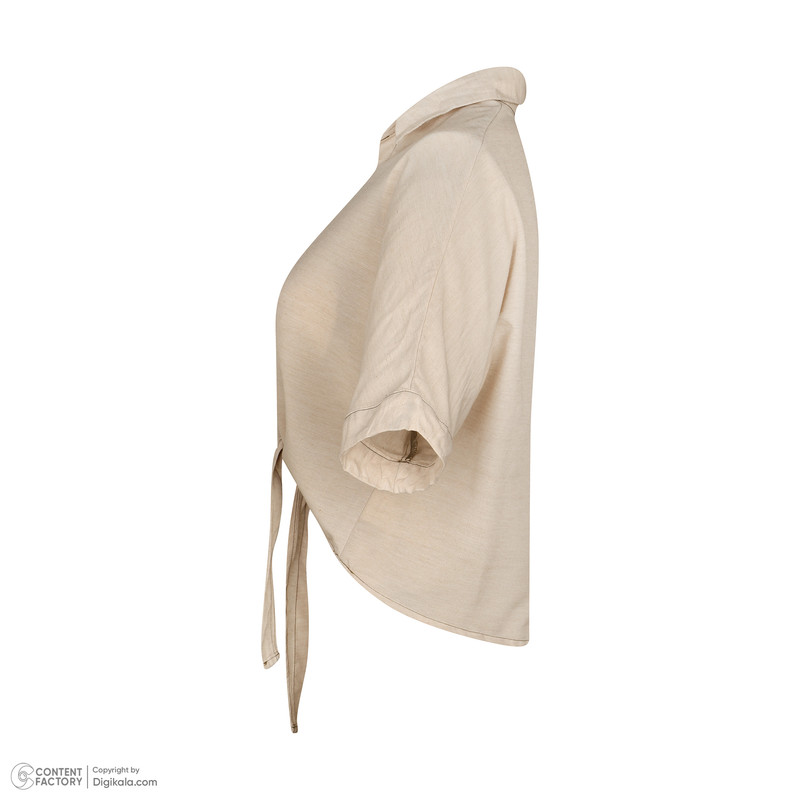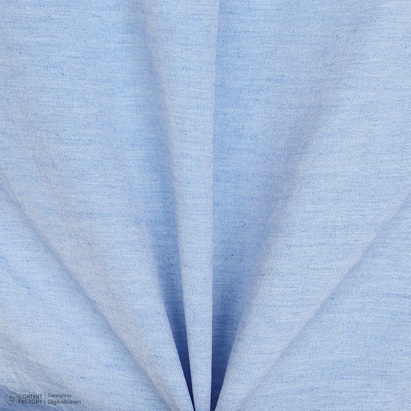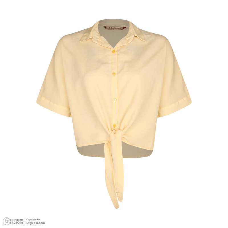 شومیز کراپ زنانه / جنس 65 درصد پلی استر - 35 درصد کتان /نحوه بسته شدن دکمه و جلو گره دار / قد تا روی کمر / دارای یقه برگردان ، رنگ آبی .