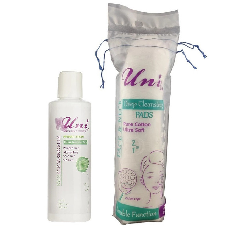ابتدا مقدار مورد نیاز از شیر پاک کن یونی لد را روی پد پاک کننده آرایش یونی لد ریخته و به آرامی از داخل به سمت خارج از پوست بکشید.