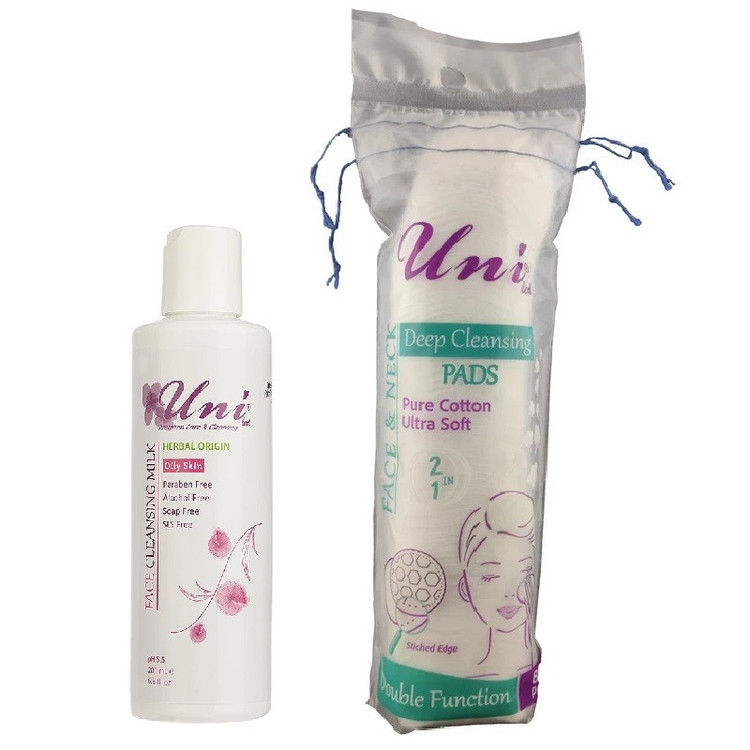 ابتدا مقدار مورد نیاز از شیر پاک کن یونی لد را روی پد پاک کننده آرایش یونی لد ریخته و به آرامی از داخل به سمت خارج از پوست بکشید.