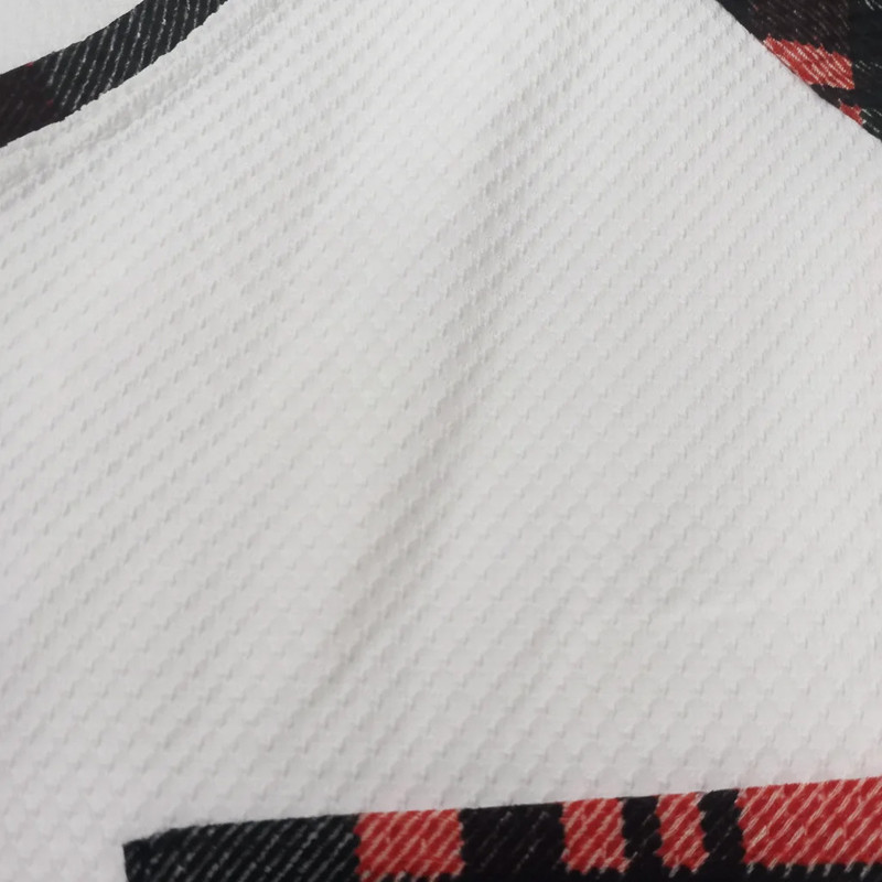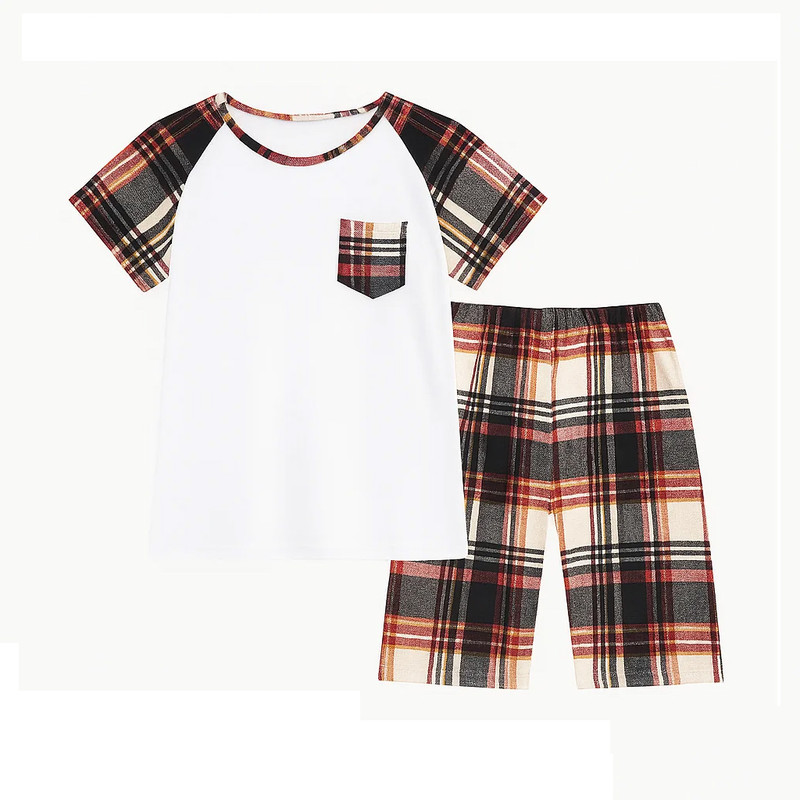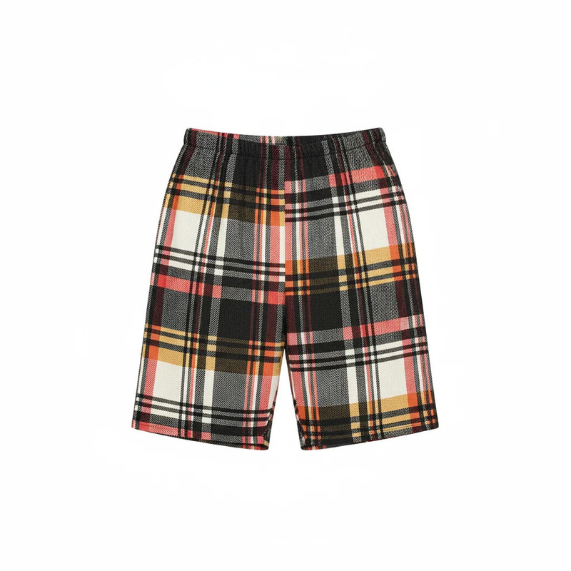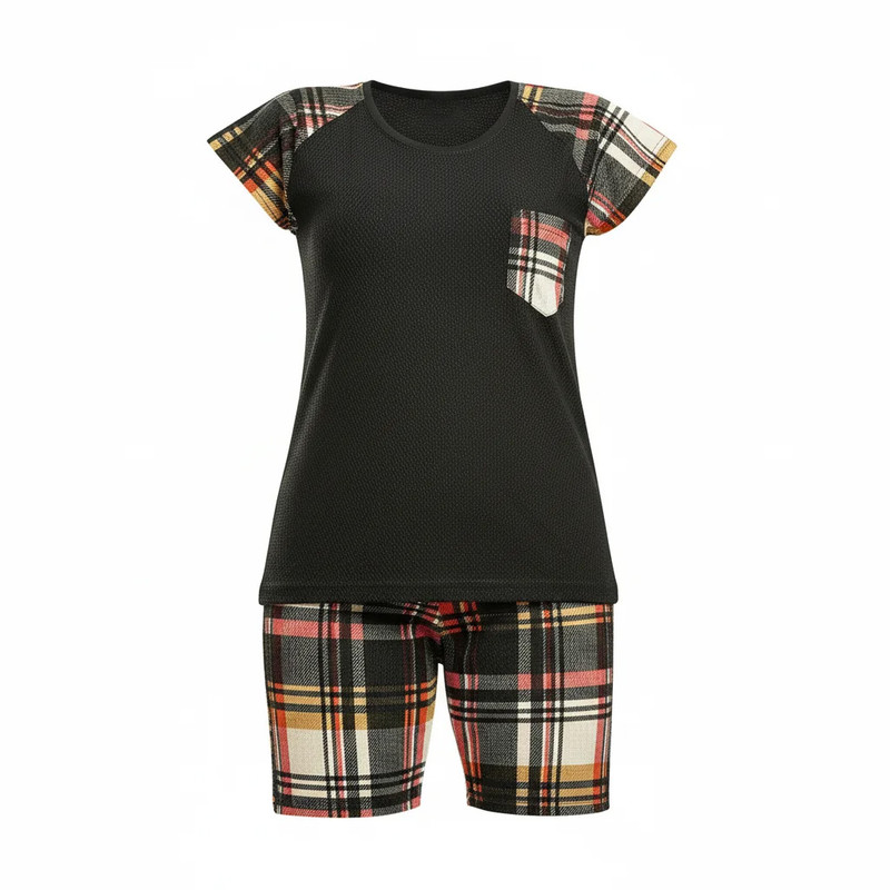 تیشرت یقه گرد با جیب چهارخانه روی سینه و سرآستینهای هماهنگ با طرح شلوارک. شلوارک چهارخانه با دو جیب کج در طرفین و کمر کشی راحت. ترکیب رنگ کلاسیک مشکی، سفید، قرمز و طلایی با دوخت تمیز و فرم اسپرت.