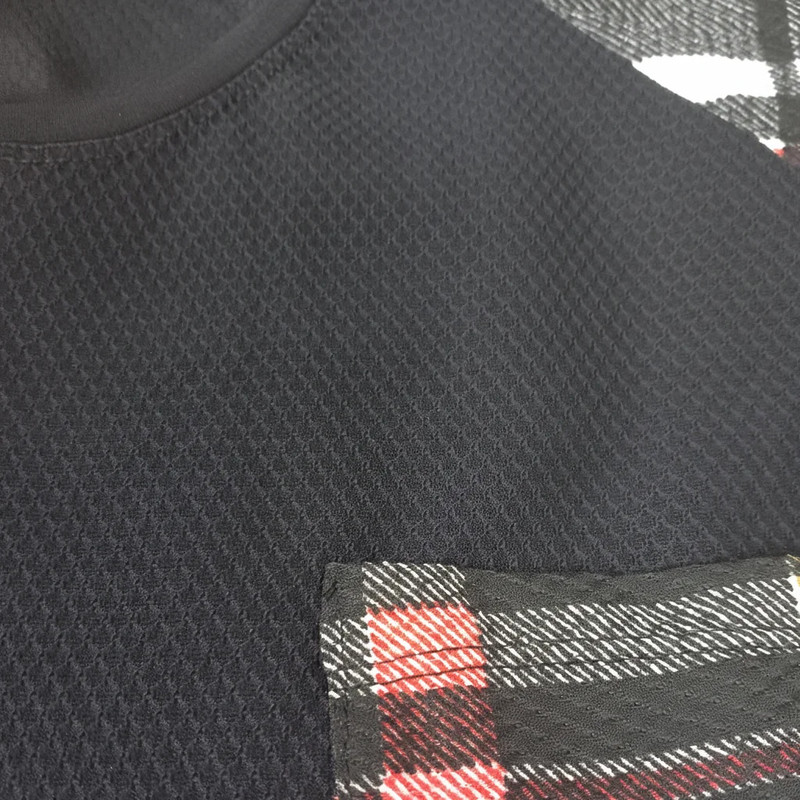 تیشرت یقه گرد با جیب چهارخانه روی سینه و سرآستینهای هماهنگ با طرح شلوارک. شلوارک چهارخانه با دو جیب کج در طرفین و کمر کشی راحت. ترکیب رنگ کلاسیک مشکی، سفید، قرمز و طلایی با دوخت تمیز و فرم اسپرت.