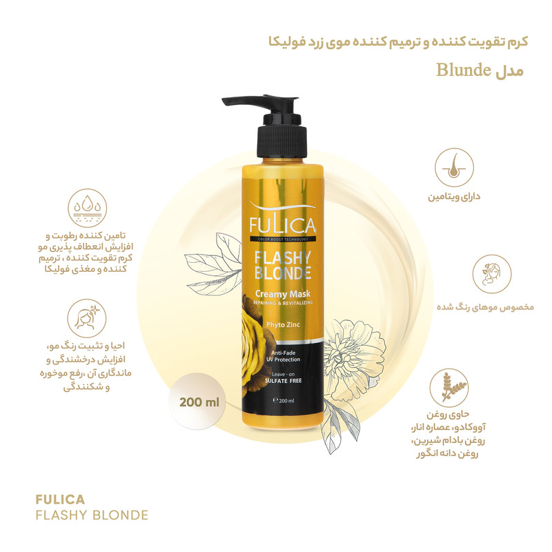 کرم تقویت کننده، ترمیم کننده و مغذی فولیکا موهای رنگ شده، انواع موهای بلوند احیا و تثبیت رنگ مو، افزایش درخشندگی و ماندگاری آن رفع موخوره و شکنندگی، جلوگیری از وزشدگی و گره خوردگی مو تامین رطوبت و افزایش انعطاف پذیری مو بدون نیاز به آبکشی