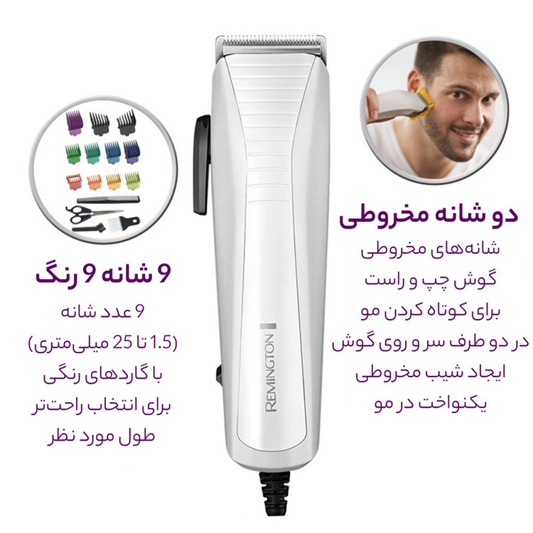 - برس گردن، قیچی و شانه - دارای سری قابل جداسازی جهت تمیز کردن - دارای 9 شانه با رنگهای مختلف برای کوتاه کردن موهای صورت و سر در اندازههای 1.5 تا 25 میلیمتر