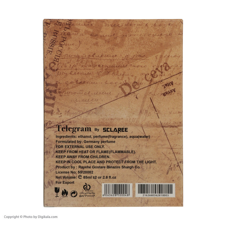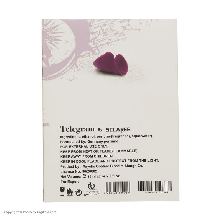 به همراه ادو پرفیوم زنانه تلگرامحجم 85 میلی لیتربا رایحه خنک و شیریننت های آغازی: نارنگی، نارنج، شکوفه گیلاسنت های میانی: گل رز، بنفشه، یاسمیننت های پایانی: صندل، بامبو، مشک