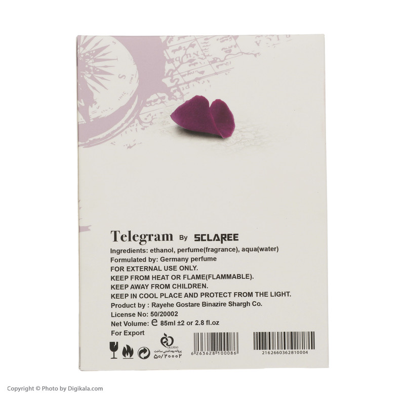 به همراه ادو پرفیوم زنانه تلگرامحجم 85 میلی لیتربا رایحه خنک و شیریننت های آغازی: نارنگی، نارنج، شکوفه گیلاسنت های میانی: گل رز، بنفشه، یاسمیننت های پایانی: صندل، بامبو، مشک