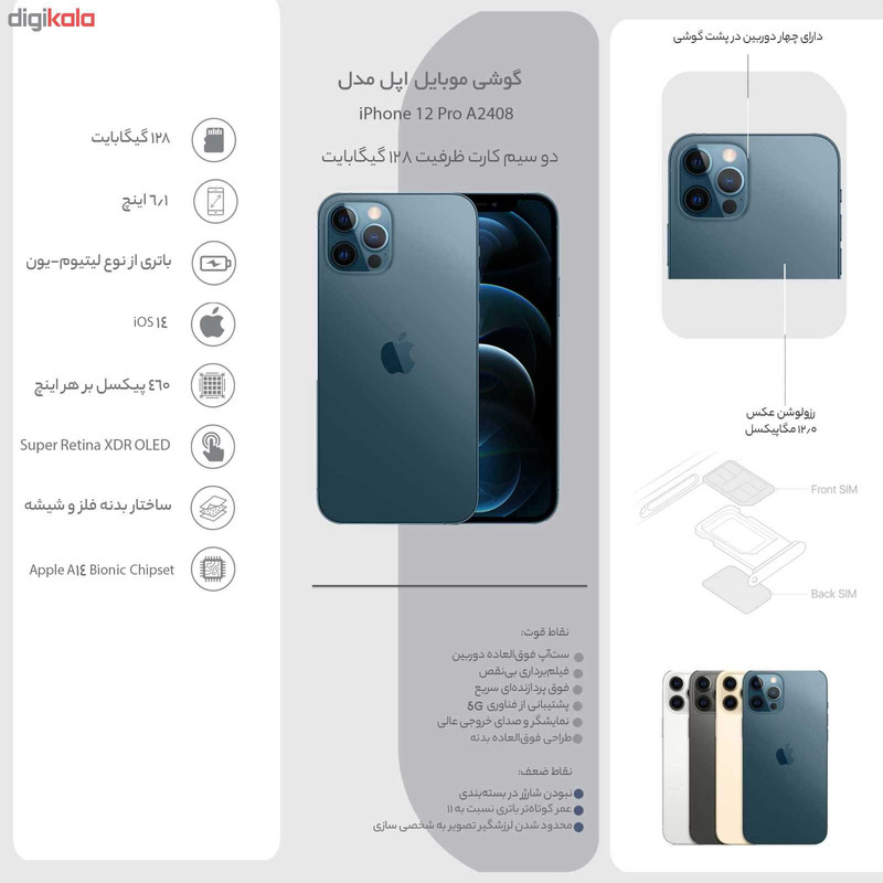 گوشی موبایل اپل مدل iPhone 12 Pro A2408 دو سیم‌ کارت ظرفیت 128 گیگابایت و رم 6 گیگابایت - نات اکتیو