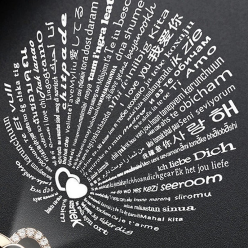 یکی از خاص ترین مدل های گردنبند که اگر داخل لنز آن نگاه کنید به صد زبان دنیا نوشته شده است دوستت دارم.