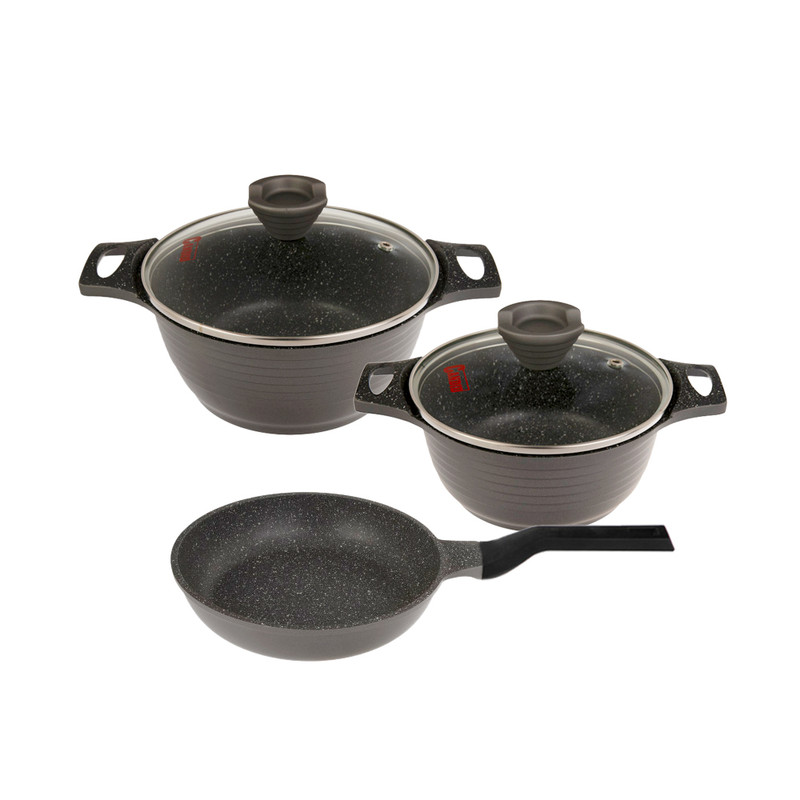 سرویس پخت و پز 5 پارچه مدل پیاژه پلاس با پوشش گرانیت در رنگبندی رزگلد و دودی و مشکی می باشد که دارای قابلمه های سایز 20 و 24 و یک عدد تابه تکدسته سایز 24 است.