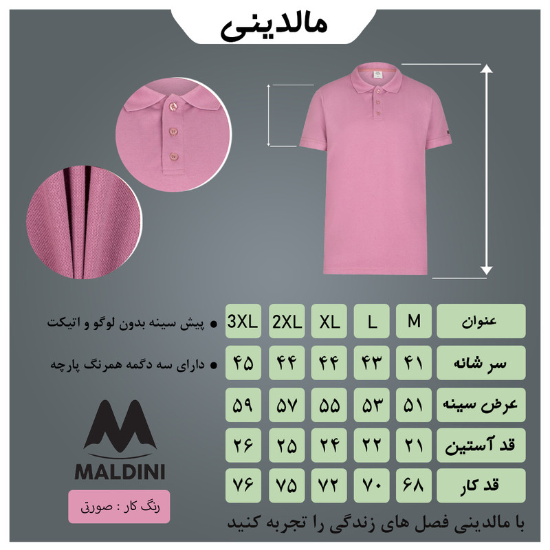 توضیحات جنس : پولوشرت مالدینی از جنس پنبه-پلی استر می باشد که بدون آب رفت و بدون نخ کش شدن می باشد . دوخت این محصول صنعتی بوده که با حساسیت و پیشرفته ترین دستگاه های خیاطی دوخته شده و کاری تمیز و با کیفیت را در اختیار شما قرار می دهد