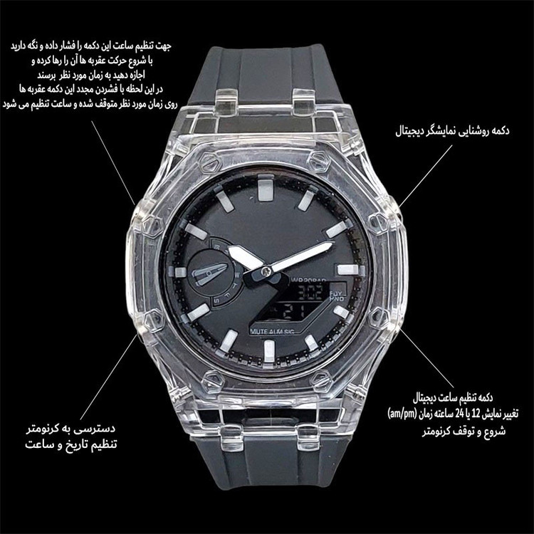 ساعت مچی عقربه‌ای کوارتز مدل دو زمانه کرنومتر دار موتور پمپی کد GA-2100GR.Y