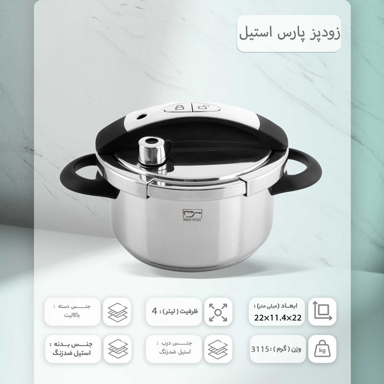 - استیل ضد خط و خش - کفه سه لایه آلومینیومی جهت جلوگیری از چسبندگی و سوختن غذا - سه سیستم تخلیه فشار جهت تامین حداکثر ایمنی - دارای دکمه روی در، بهمنظور باز و بسته کردن آسان - قابل شستشو در ماشین ظرفشویی