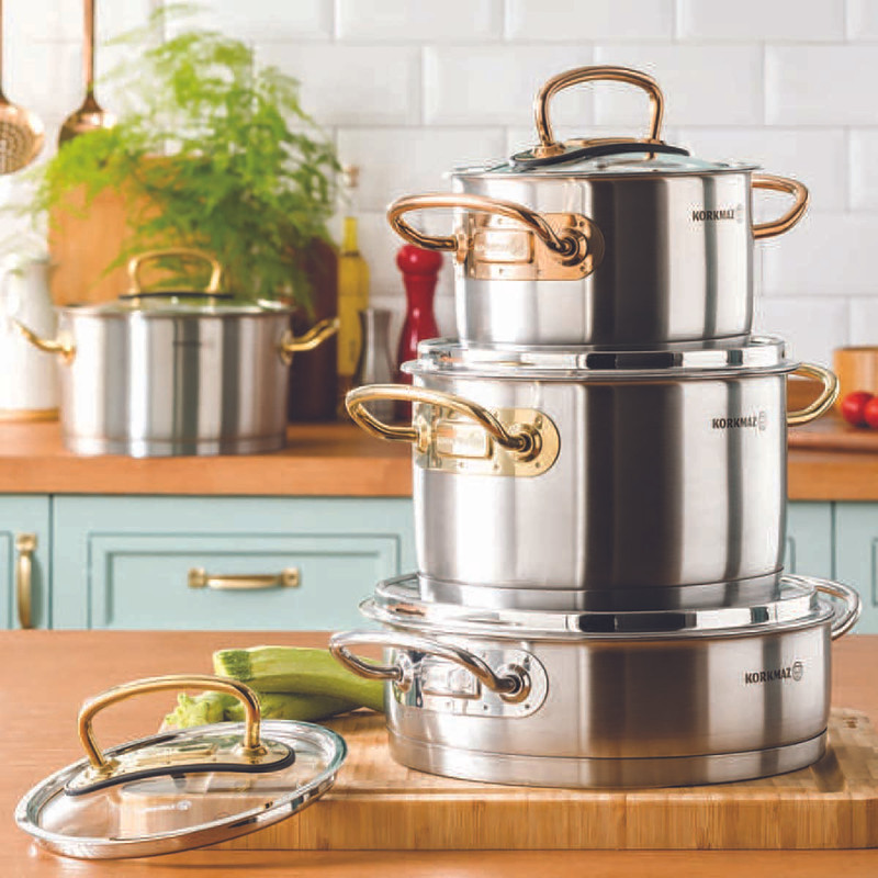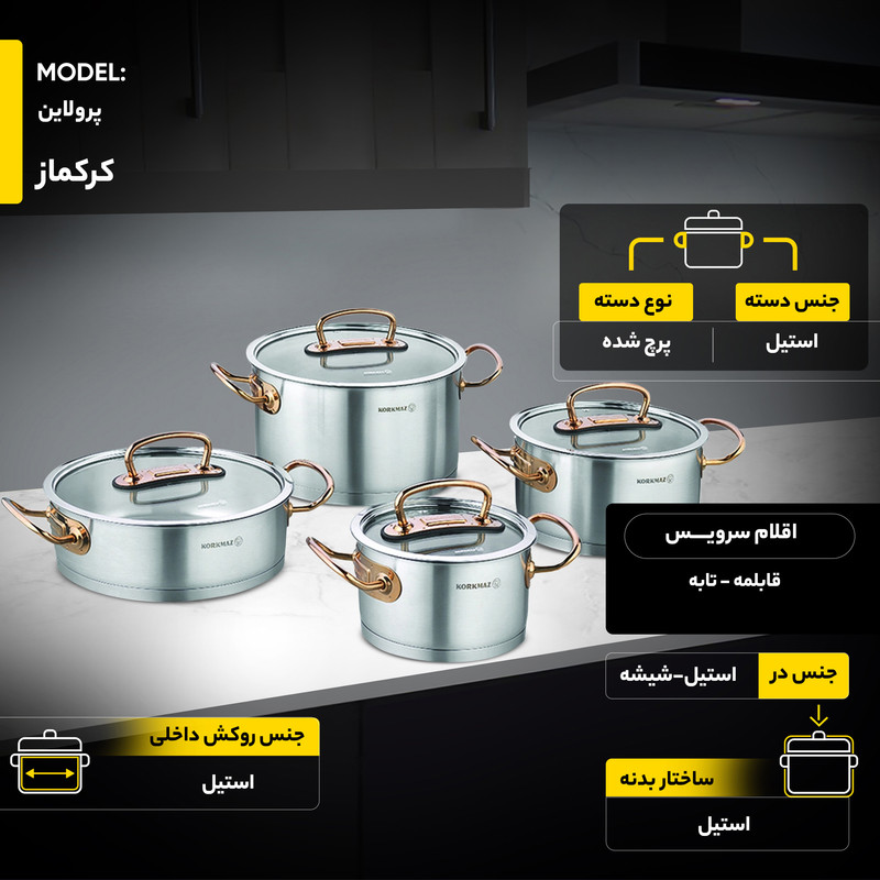 سرویس پخت و پز ۸ پارچه کرکماز مدل پرولاین از استیل ضدزنگ ۱۸/۱۰ ترکیهای ساخته شده و شامل سه قابلمه همراه درب در ابعاد ۱۶، ۲۰ و ۲۴ سانتیمتر و یک تابه دربدار ۲۴ سانتیمتری است. ساختار کف سهلایه کپسولی با ضخامت ۸ میلیمتر گرما را بهصورت یکنواخت در سطح ظروف پخش میکند و باعث میشود پخت غذا سالمتر و سریعتر باشد.