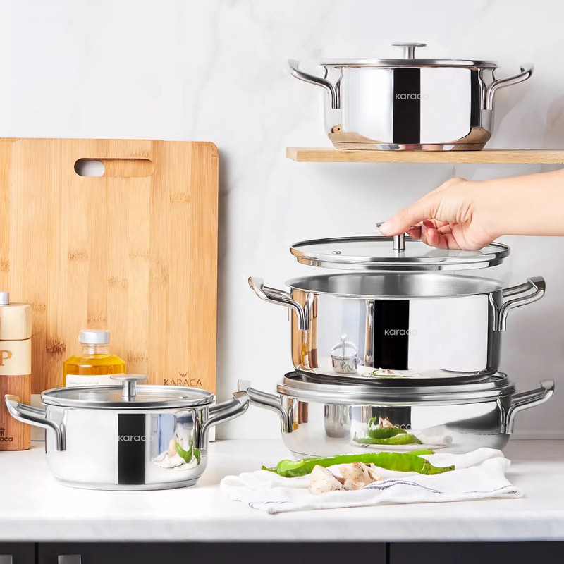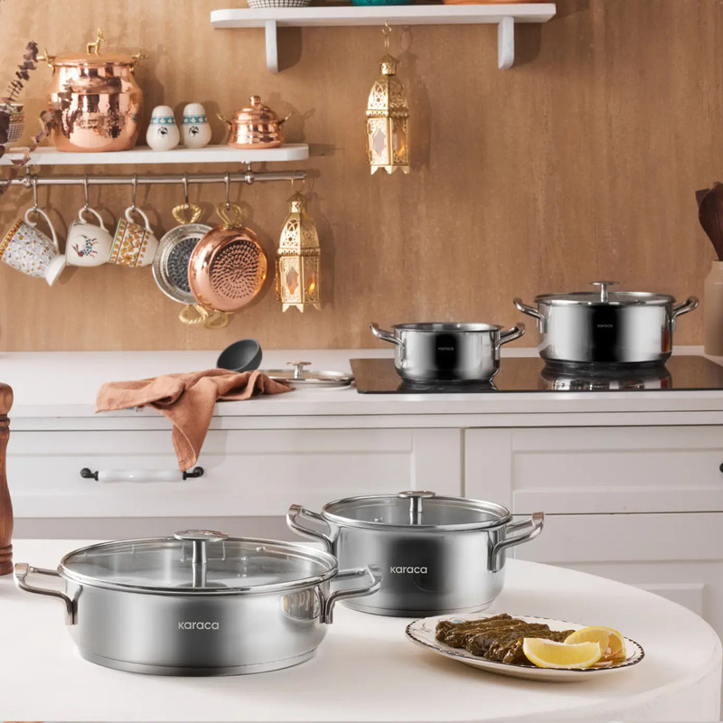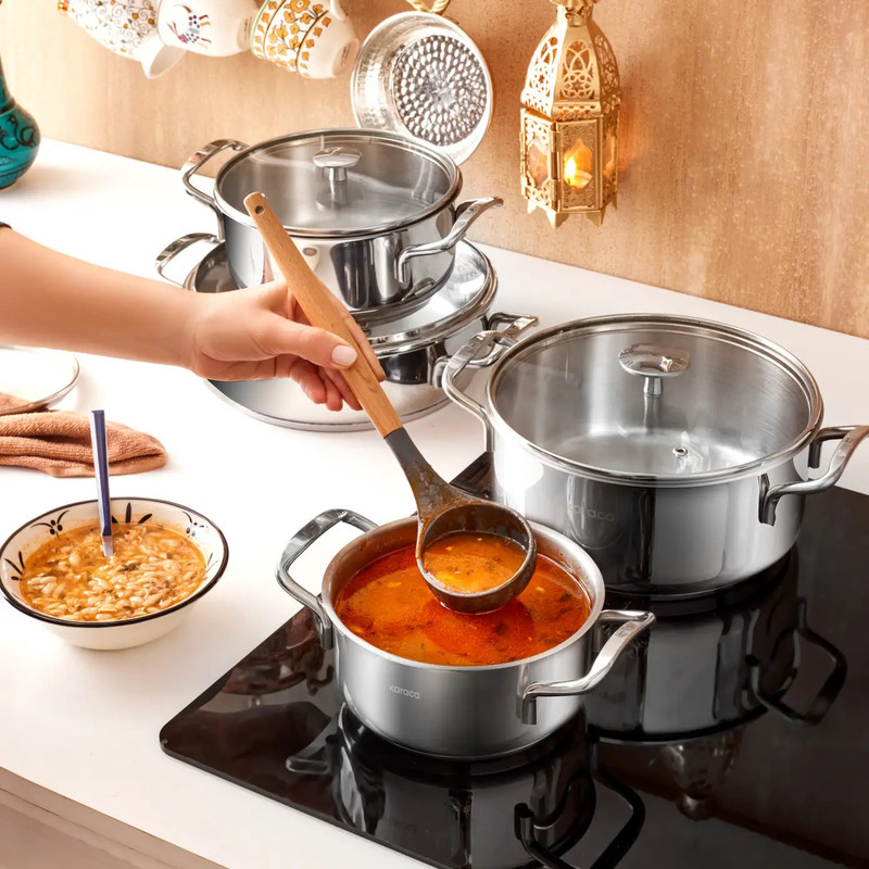 **سرویس پختوپز ۸ پارچه Karaca Alaz** با طراحی مدرن و عملکرد حرفهای، انتخابی ایدهآل برای آشپزخانههای امروزی است. این مجموعه از **فولاد ضدزنگ ۱۸/۱۰** ساخته شده که علاوه بر دوام بالا، پخت سالم و بهداشتی را تضمین میکند. **توزیع یکنواخت حرارت** بهویژه در قسمت کف قابلمهها، باعث پخت مطلوب غذا در تمام نقاط میشود و طعمی بینظیر ایجاد میکند. **دربهای مقاوم از جنس شیشهی نشکن** امکان مشاهدهی مراحل پخت را بدون نیاز به باز کردن درب فراهم میکند، درحالیکه **دستههای ارگونومیک فلزی** ایمنی و راحتی را هنگام استفاده افزایش میدهند. این سرویس با **سطح بیرونی براق **، زیبایی اولیهی خود را سالها حفظ میکند و با قابلیت شستوشو در ماشین ظرفشویی، نگهداری آن آسان است. مجموعه شامل چهار قابلمه در سایزهای متنوع (1.6 تا 3.8 لیتری) است که نیازهای پختوپز روزمره تا مهمانیها را پوشش میدهد و با تمام انواع اجاقها (گاز، القایی، سرامیک و برقی) سازگاری دارد. Karaca Alaz ترکیبی از **طراحی شیک، عملکرد حرفهای و ماندگاری بالا** است که تجربهی لذتبخشی از آشپزی را برای شما به ارمغان میآورد.