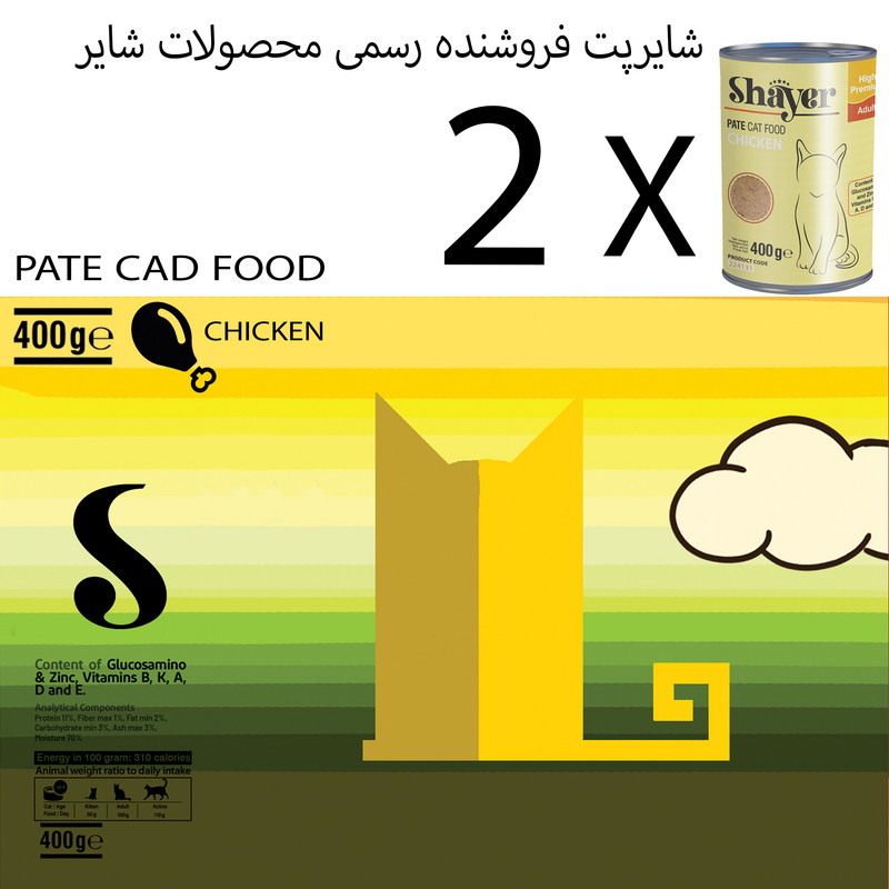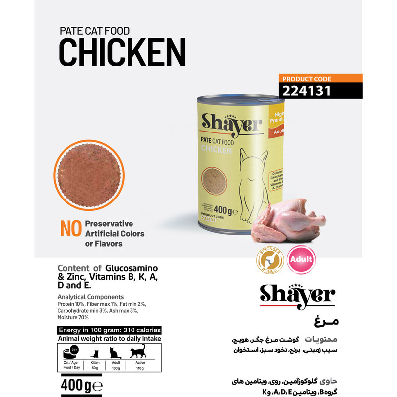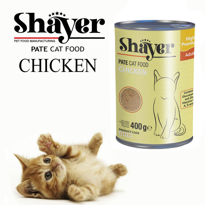 کنسرو گربه شایر با طعم مرغ حاوی امولسیون یکنواخت شده مرغ همراه با جگر، کمی برنج، هویج، نخود سبز، کلم و استخوان میباشد. حاوی پروتئین، کربوهیدرات، مواد معدنی، فیبر و چربی، ترکیب مایعات و افزودنیهای طبیعی مغذی است. این کنسرو با توجه به داشتن پروتئین و فیبر لازم و مواد مغذی کاملا طبیعی برای تمامی سنین مناسب است.