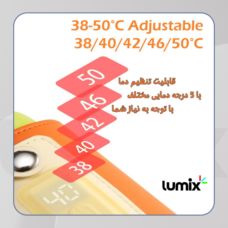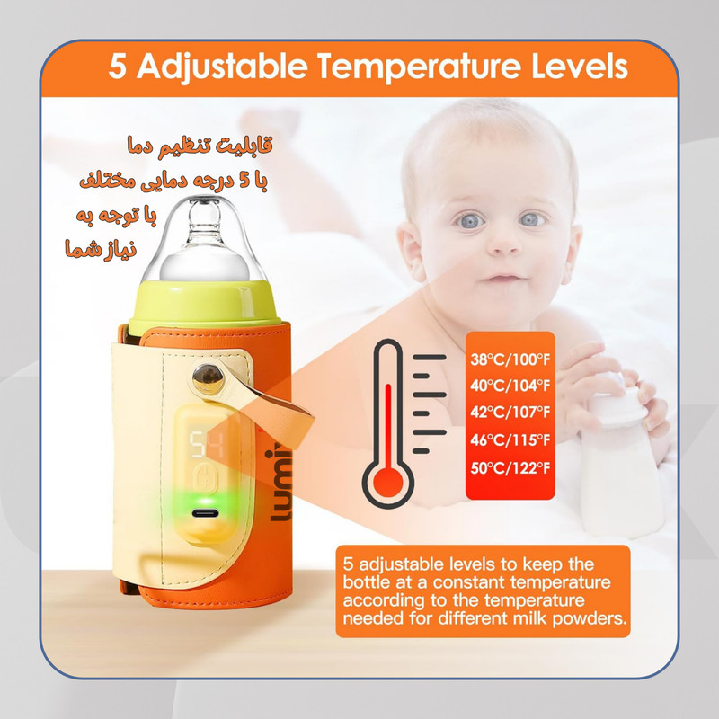 شیشه شیر گرمکن دارای 6 سطح دمای قابل تنظیم می باشد تا بتوانید متناسب با نوع شیر یا غذای کودک، دمای مناسب را انتخاب کنید. نمایشگر LCD دمای لحظهای را نمایش میدهد و به والدین کمک میکند دما را با دقت کنترل کنند.