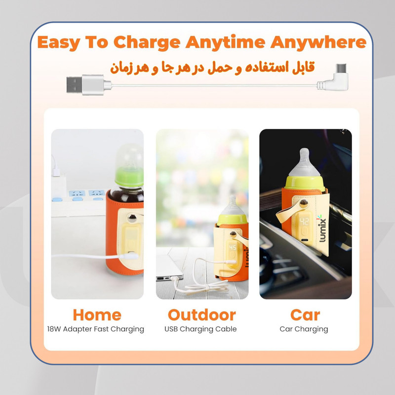 گرمکن شیشه شیر با وزن تنها 141 گرم و ابعاد جمعوجور، بهراحتی در کیف نوزاد جا میگیرد و برای سفر یا استفاده روزمره انتخابی عالی است. این دستگاه بدون نیاز به باتری کار میکند و با استفاده از کابل برق یا پاوربانک قابل استفاده است.
