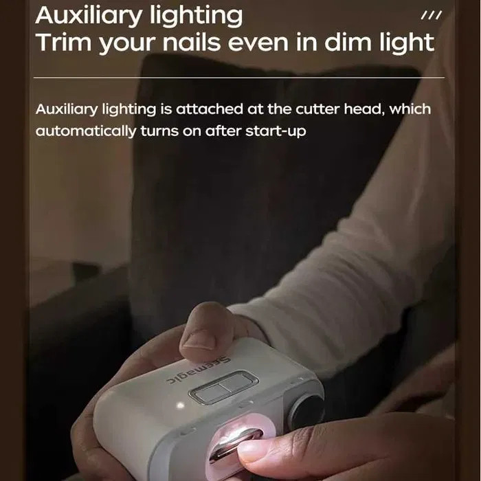ناخن گیر اتوماتیک SEEMAGIC به شما کمک می کند تا بدون درد و یا آسیب به راحتی نظافت دستان خود و خانواده تان را حفظ کرده و ناخن هاییی زیباتر داشته باشید. خیلی از ما ممکن است که با گرفتن ناخن هایمانچن دچار مشکل شده باشیم. چراکه ناخن گیر های قدیمی اسیب بسیاری به صدف و حتی پوست دست ما می رسانند. اما با ناخن گیر اتوماتیک SEEMAGIC نه تنها این مشکل بلکه گرفتن ناخن فرزندانمان راحت تر شده است. دهانه منحنی طراحی شده در این ناخن گیر بهتر به نوک انگشتان می خورد، به طور موثر از آسیب تصادفی جلوگیری می کند. نور کمکی قسمت روی ناخن گیر پس از راه اندازی به طور خودکار به سر کاتر پاپ آپ اضافه می شود که دید را برای گرفتن ناخن ها بیشتر می کند. هنگامی که محصول در حال استفاده است، صدا در حدود 40 دسی بل است و صدای بیس مانند یک زمزمهی کوتاه می ماند. بدنه شیک و با کاربری آسان باعث می شود بچه ها عاشق کوتاه کردن ناخن شوند. طراحی ذخیره سازی پشتی اجازه می دهد تا ناخن های چیده شده در سطل زباله ناخن مکیده شوند تا از تمیزی و بهداشت اطمینان حاصل شود. این دستگاه دارای سوهان ناخن و پولیش برقی نیز میباشد.