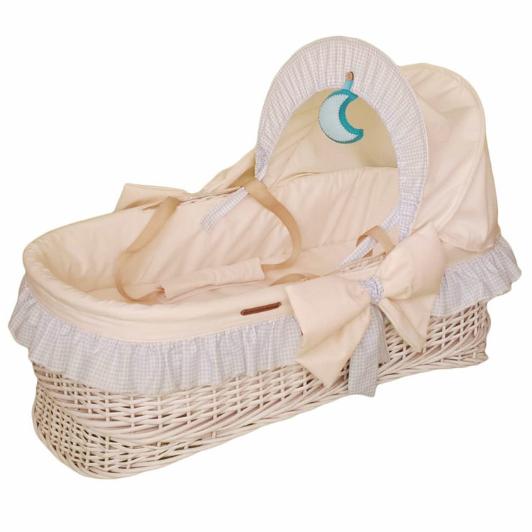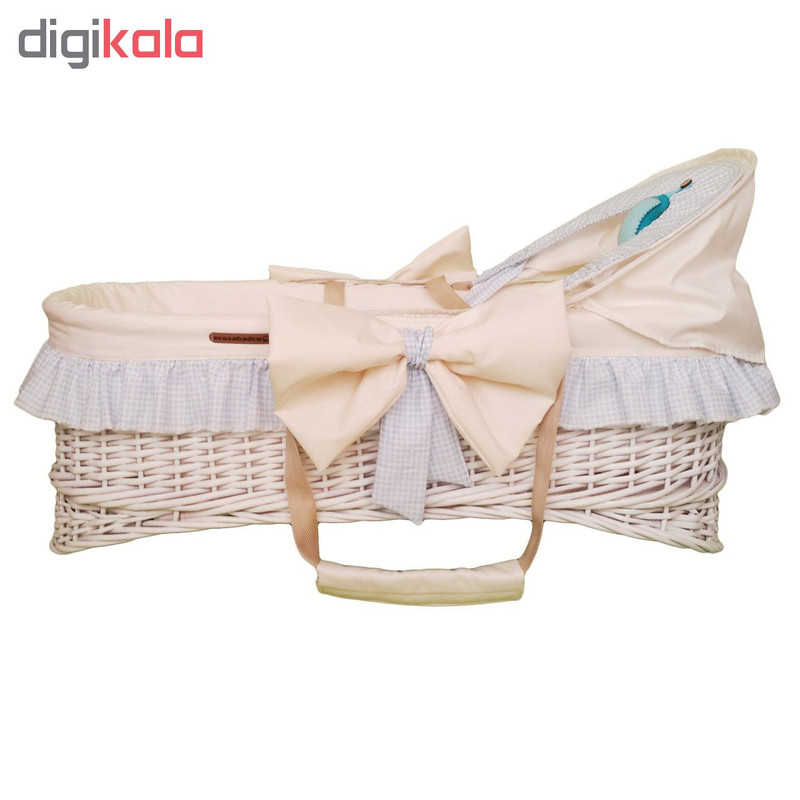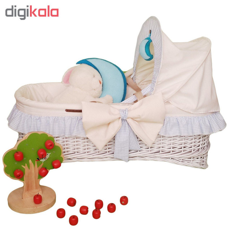 همانطور که می دانید، مهمترین مزیت چنین سبد حملی تخت بودن کف آن می باشد که برای رشد ستون فقرات نوزاد مناسب می باشد. این سبد زیبا می تواند وسیله خوبی برای حمل نوزاد از بیمارستان به منزل باشد. همچنین در منزل کنار تخت مادر، یا در مهمانی یا هر مکان دیگر خارج از منزل جای خواب راحت و آرامی را برای کودک دلبند شما فراهم می کند. توجه داشته باشید که هلالی که در دو طرف زیرین سبد در نظر گرفته شده، آن را تبدیل به گهواره ای کوچک کرده که می تواند برای آرام کردن یا خواباندن کودک نیز مورد استفاده قرار گیرد. لایی پر چین و نرم سبدکو در تم آبی، زیبایی ملایمی به آن بخشیده است. همچنین این سبد با یک تشک نرم و یک جفت دسته بند پارچه ای مخصوص کامل می شود. یک آویز ماه آبی رنگ نصب شده روی سایه بان آسمان کودک شما را تزیین کرده است. درصورت تمایل می توانید سایر اجزای مجموعه ماه آبی را برحسب سلیقه برای کودک خود تهیه نمایید.
