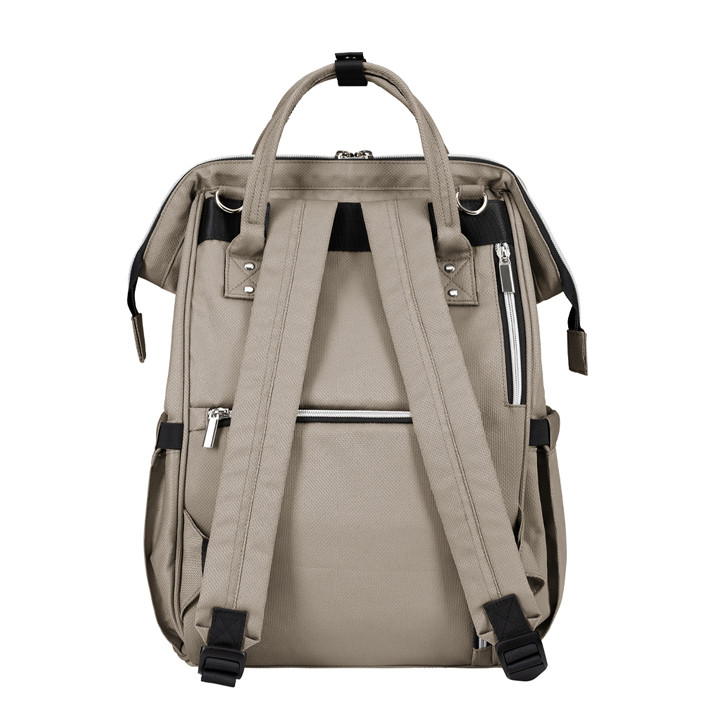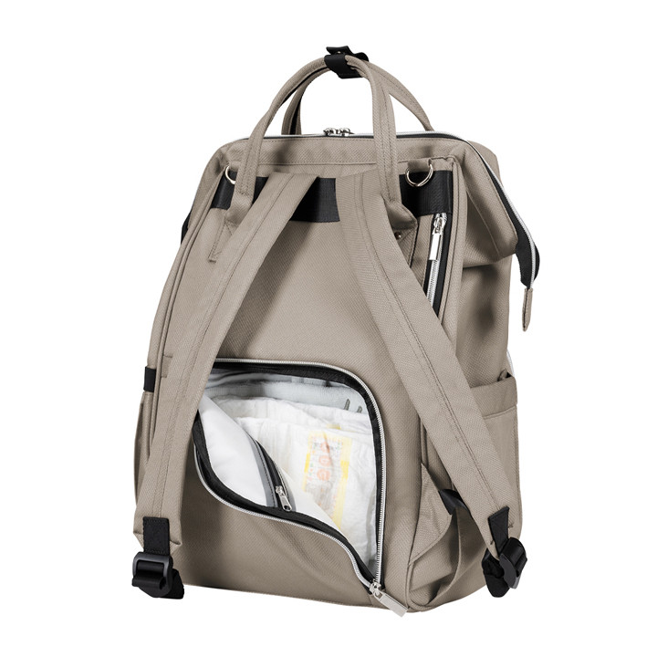 تهیه شده از پارچه ی ملانژ لوکس جنس 100 درصد پلی استر دهانه ی عریض جیب های کوچک مخصوص وسایل دارای بخش مجهز به عایق دارای زیرانداز تعویض دارای بند اتصال به کالسکه سایز 40*27*14 سانتی متر وزن 800 گرم