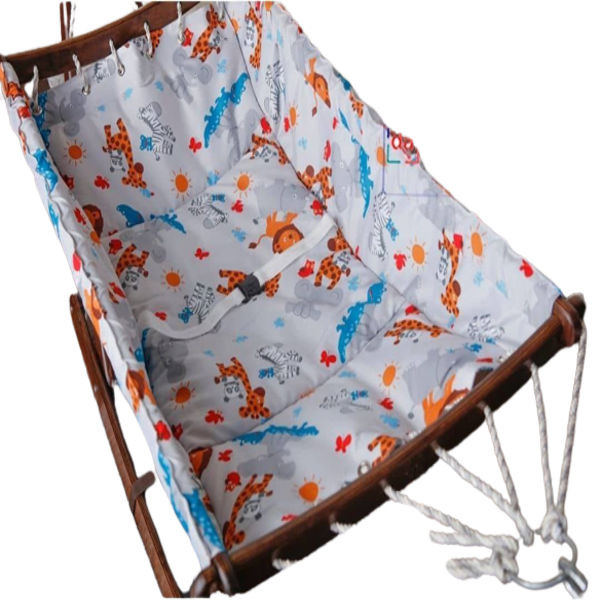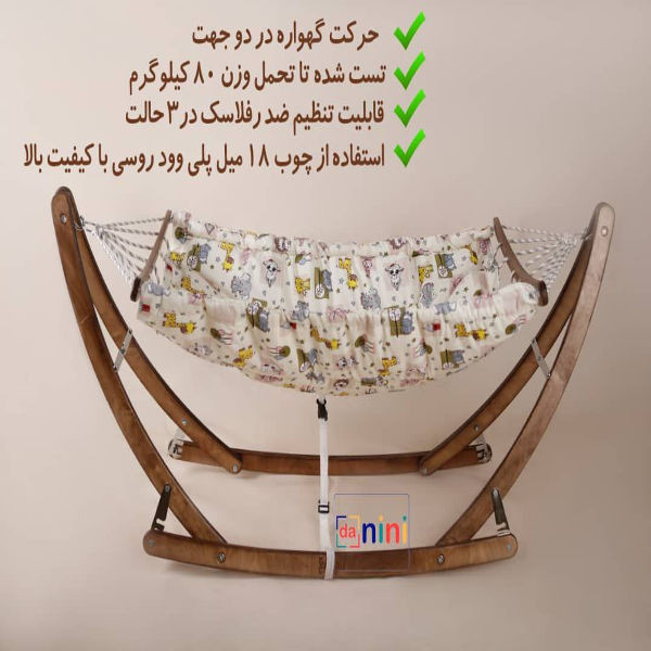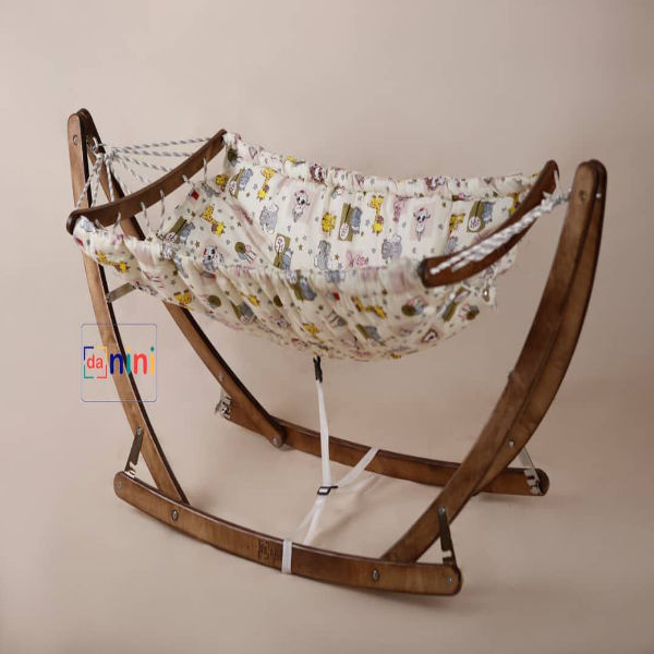 گهواره سنتی تاشو نوزاد چوبی که دارای قابلیت تاشو بودن و پارچه کتان پنبه است.