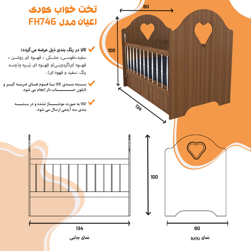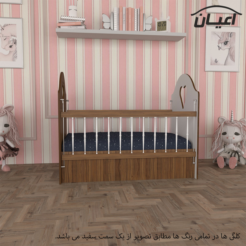 تخت خواب کودک اعیان ، جنس کلگی بالا و پایین تخت خواب مغزی ام دی اف با روکش وکیوم می باشد ، جنس بغل تخت ها و قیدهای تختخواب مغزی نئوپان با روکش ملامینه شرکتی است و کفی تختخواب یک تکه و نئوپان است. نرده های تخت خواب از نوع خراطی و به صورت pvc هستند.این محصول دارای سی ان سی طرح قلب روی کلگی ها می باشد. در نظر داشته باشید کالا فاقد تشک است. تشک مناسب سایز 70*130 سانتی متر است ، این کالا را فقط با لوگو و برند اعیان تهیه کنید، این کالا در رنگ بندی : سفید ، طوسی ، مشکی ، قهوه ای روشن ، قهوه ای (گردویی) ، قهوه ای تیره (ونگه) و حالت چند رنگ (سفید - قهوه ای) تولید و عرضه می گردد.