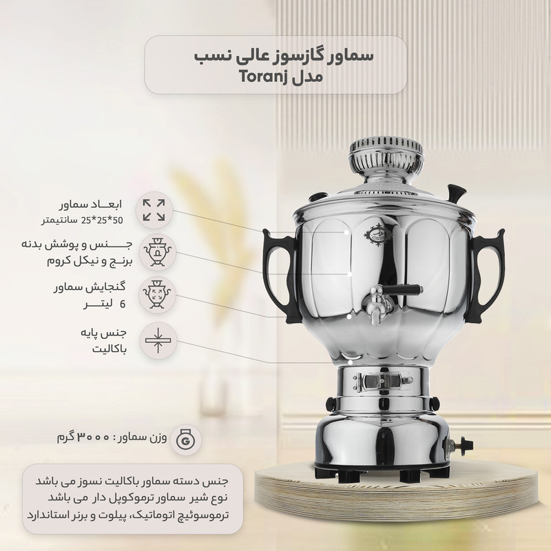 - دارای شیر ترموکوپل دار و برنر استاندارد جهت ایمنی بیشتری - دارای ترموسوییچ اتوماتیک جهت خاموش شدن سماور در هنگام بی آبی